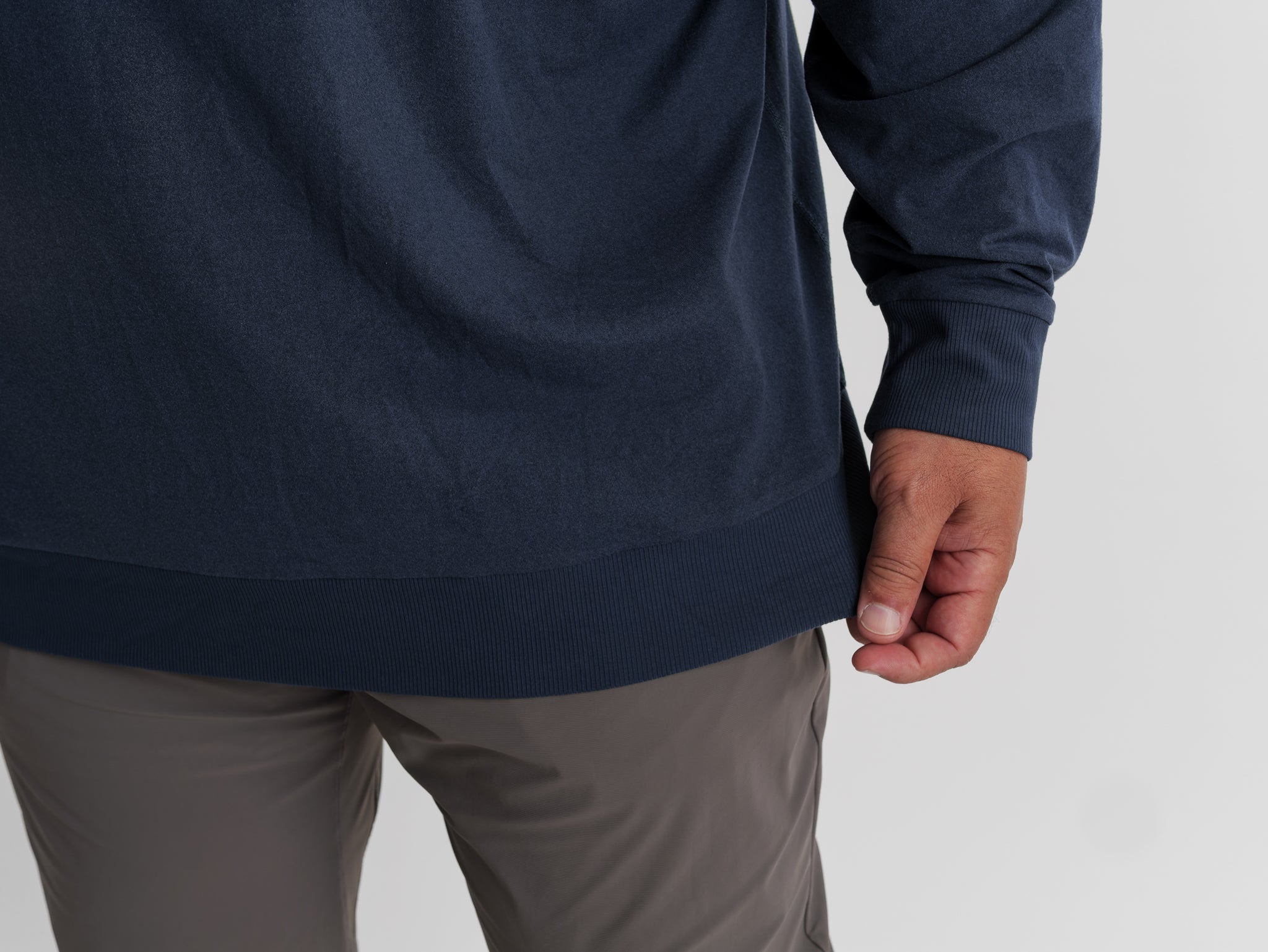 This pullover has a relaxed fit, with the fabric’s internal fiber flexibility creating a natural drape that may make the garment appear slightly longer when worn. This is an intentional design feature that enhances comfort and range of motion. For a more fitted look through the torso and arms, consider sizing down; otherwise, select your usual size to enjoy the relaxed, effortless fit the Parker Pullover was designed to deliver.
